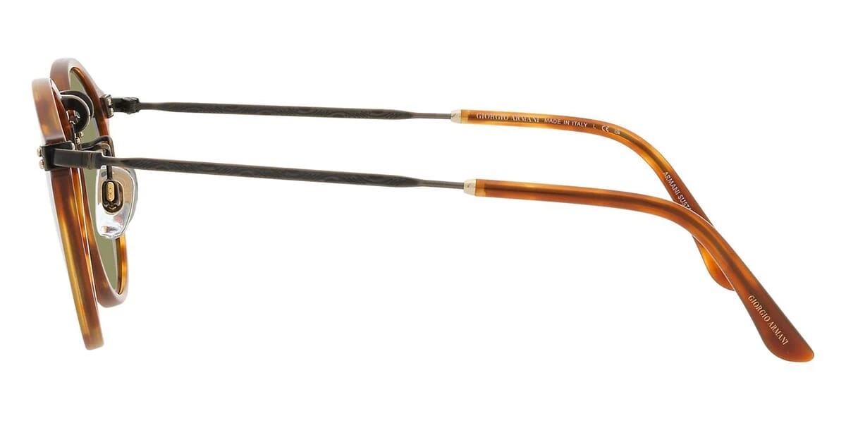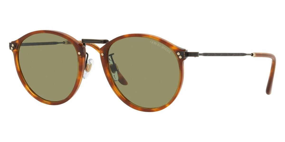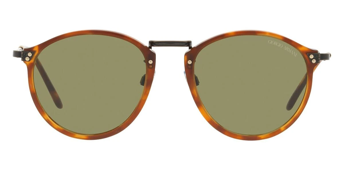 This round Giorgio Armani sunglass comes in a red havana frame with green lenses.