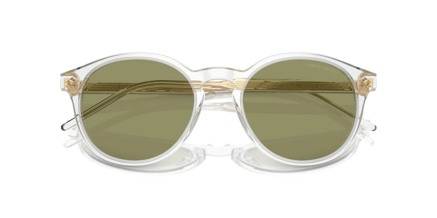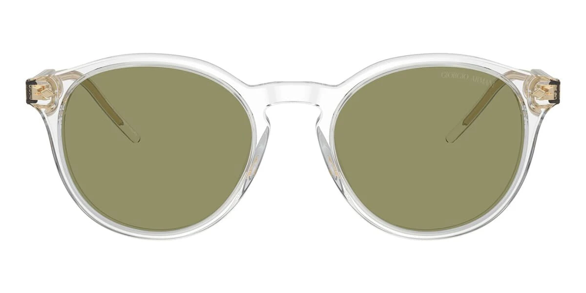 This round Giorgio Armani sunglass comes in a crystal frame with green lenses.