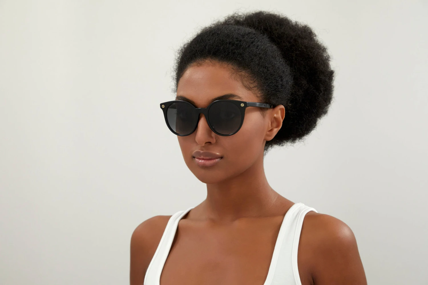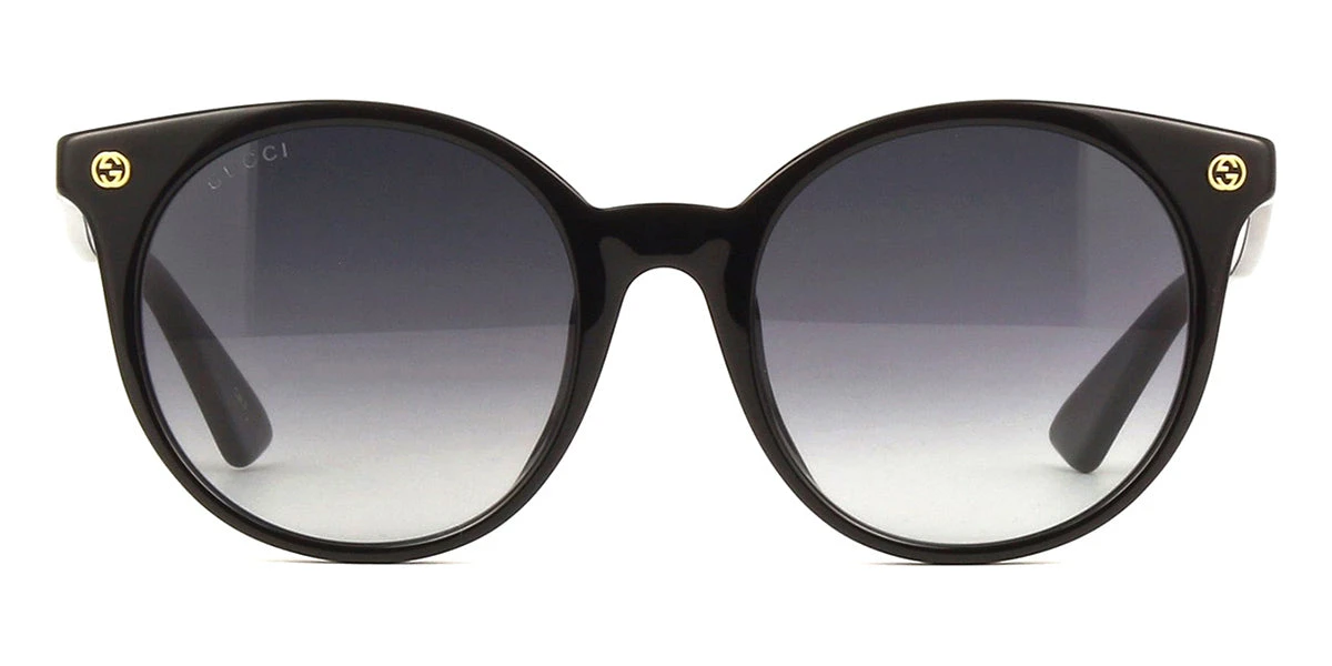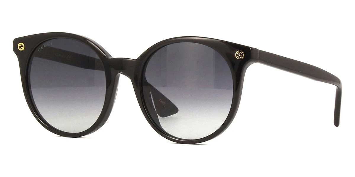 This round Gucci sunglass comes in a black frame with grey gradient lenses.