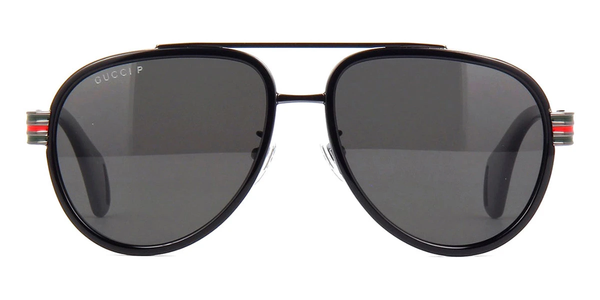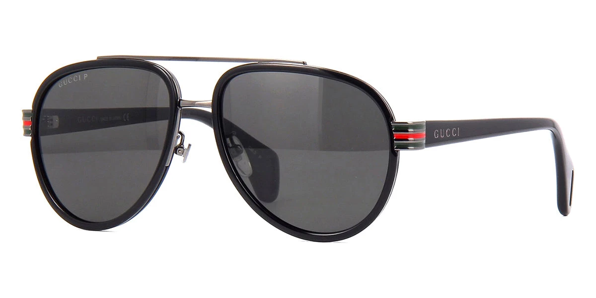 This aviator Gucci sunglass comes in a black and dark ruthenium frame with grey polarised lenses.