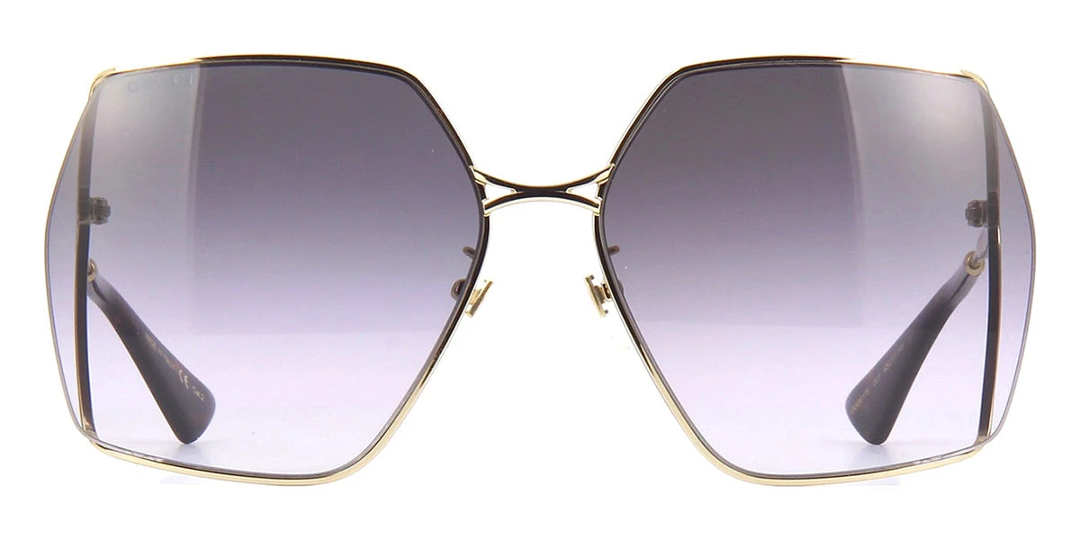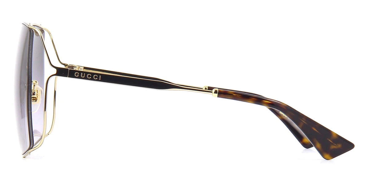 This square Gucci sunglass comes in a gold frame with grey gradient lenses.