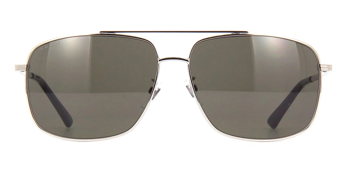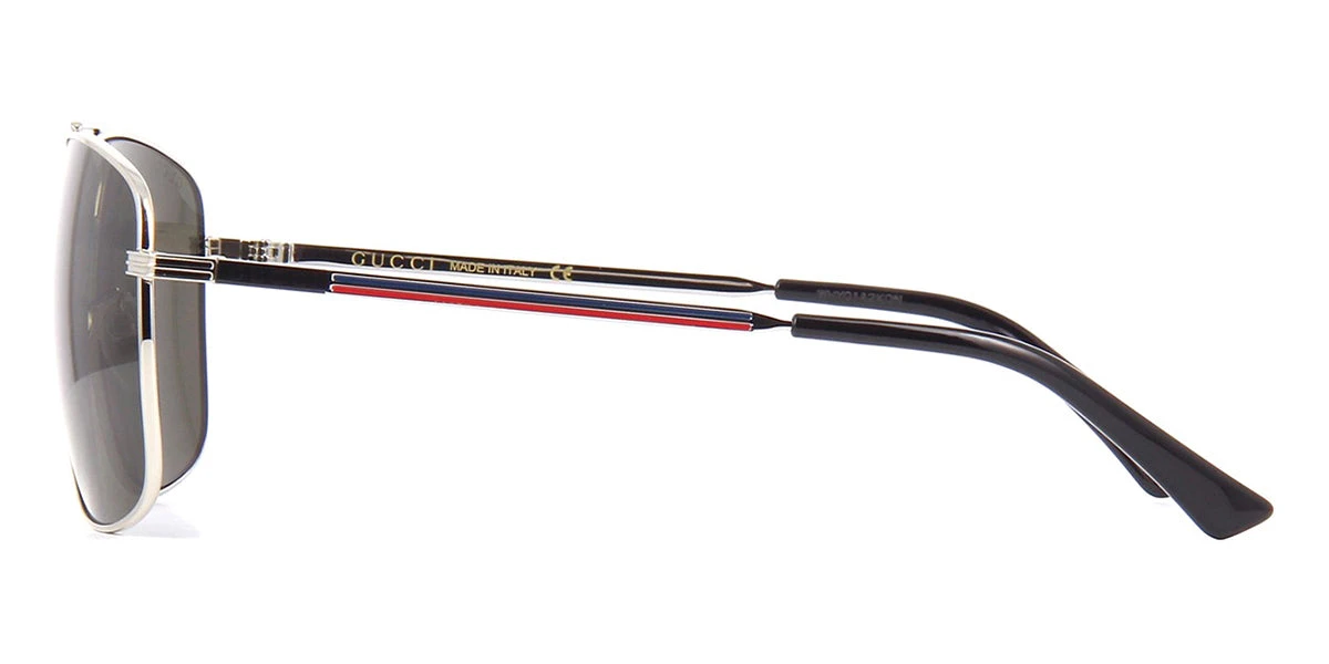 This square Gucci sunglass comes in a silver frame with grey lenses.