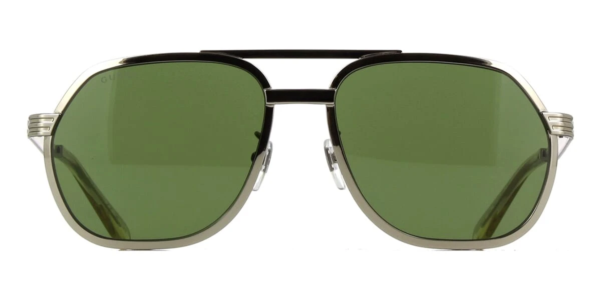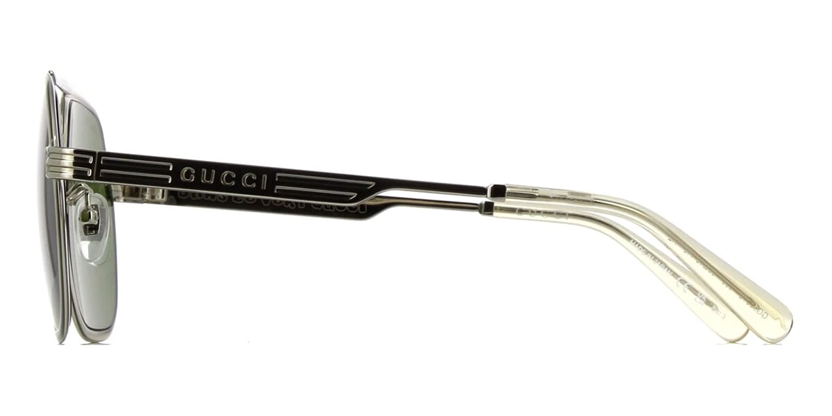 This square Gucci sunglass comes in a shiny silver frame with green lenses.