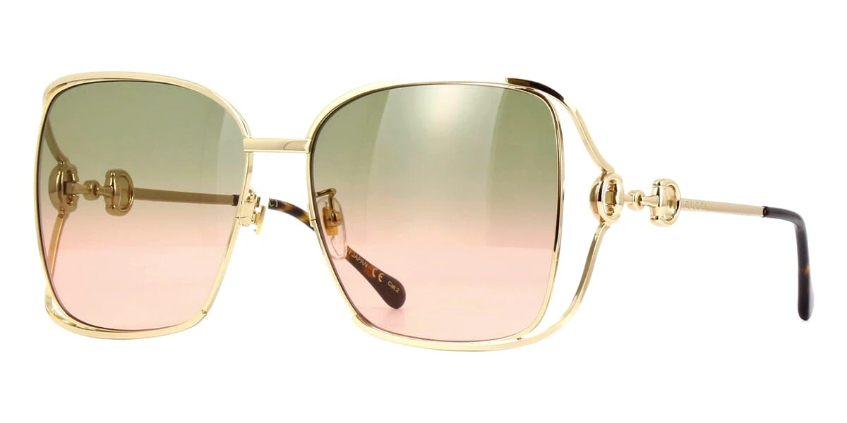 This square Gucci sunglass comes in a gold frame with green to pink gradient light mirrored lenses and is enhanced by the addition of the iconic Horsebit motif featured on gold temples, paying homage to the House’s equestrian heritage.