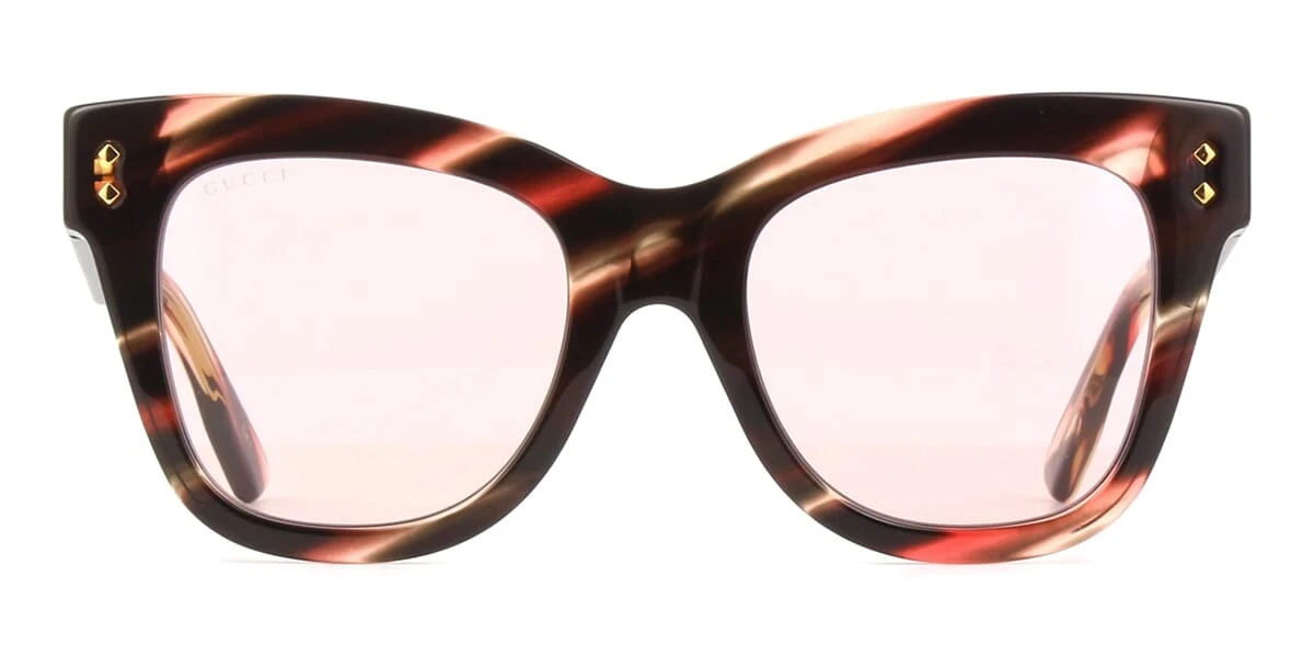 This square Gucci sunglass comes in a striped pink havana frame with light pink lenses.