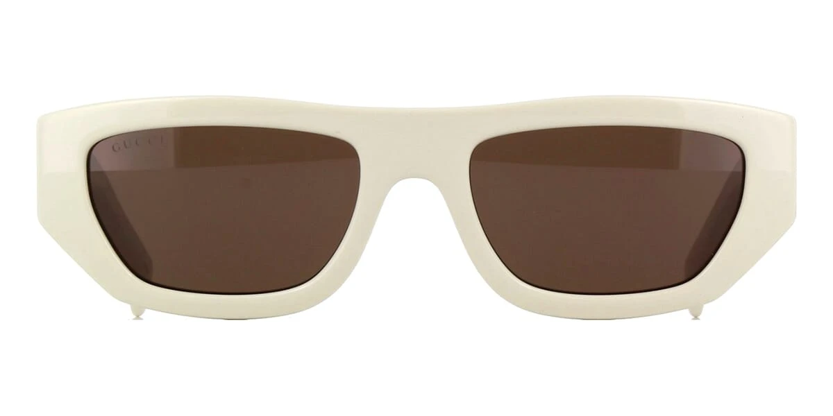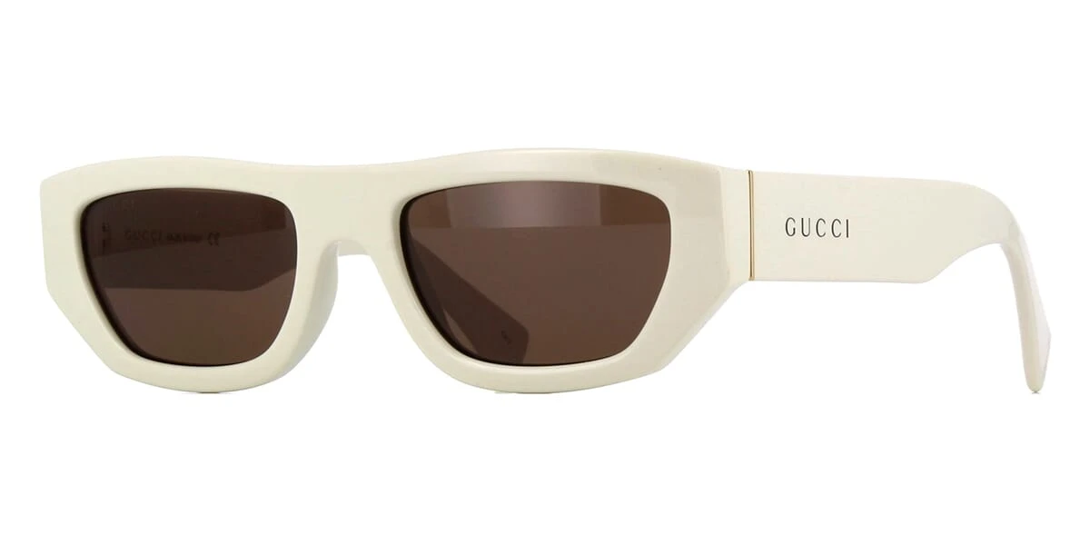 This rectangular Gucci sunglass comes in a ivory frame with brown lenses.