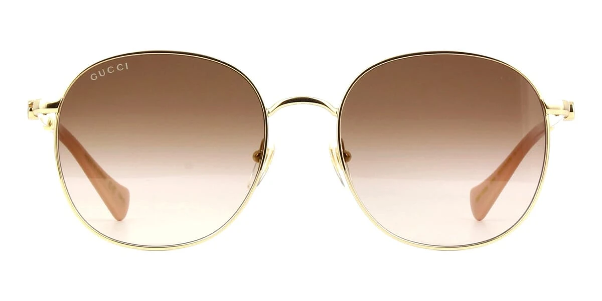 This round Gucci sunglass comes in a gold frame with brown gradient lenses.