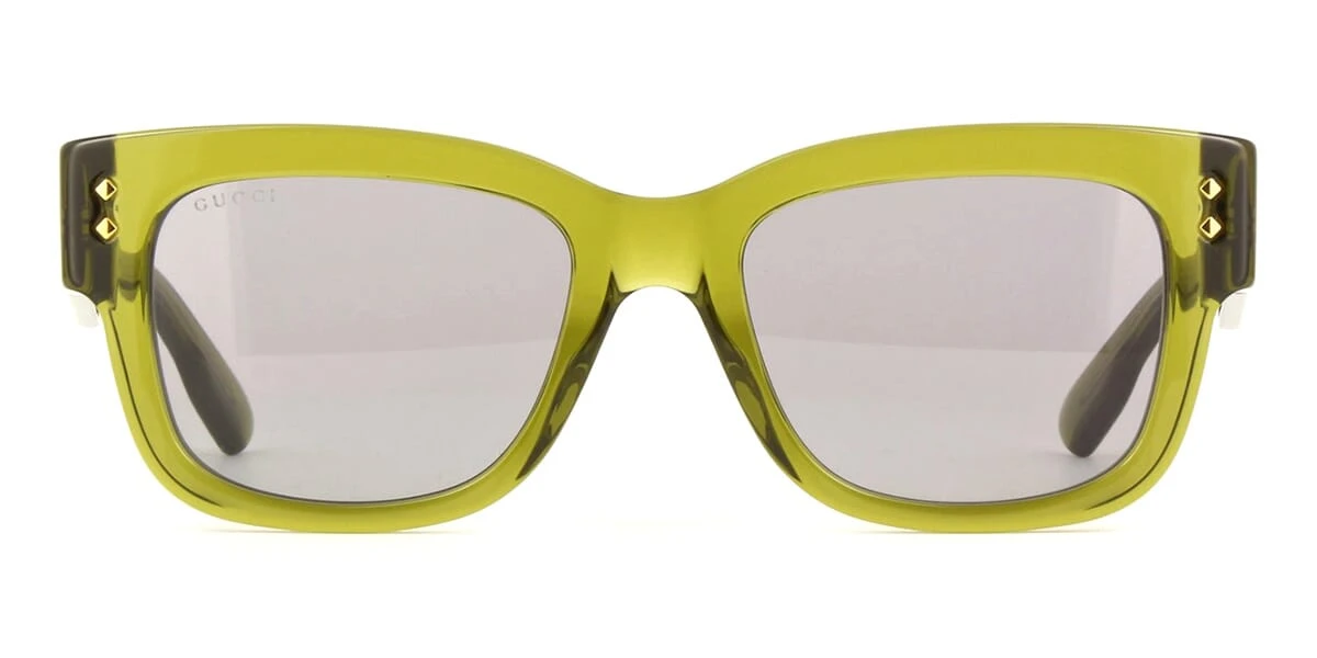 This square Gucci sunglass comes in a green crystal frame with grey lenses.