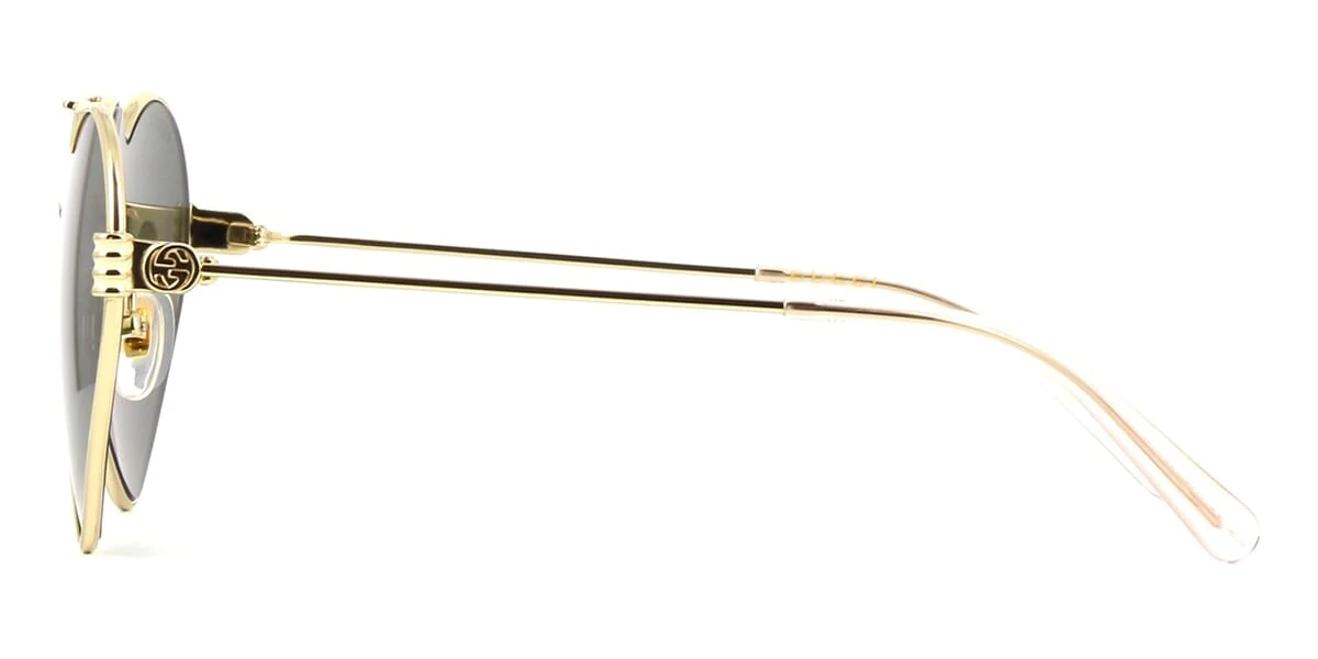This cat eye Gucci sunglass comes in a shiny gold frame with grey lenses.