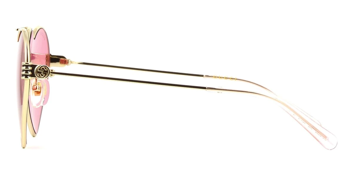 This cat eye Gucci sunglass comes in a shiny gold frame with red lenses.