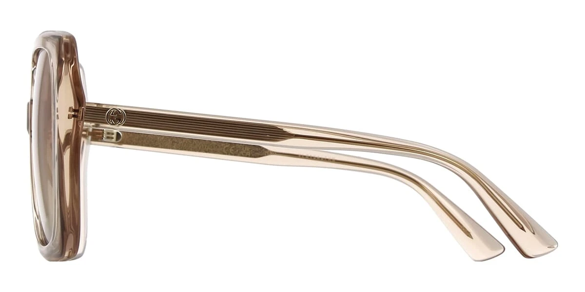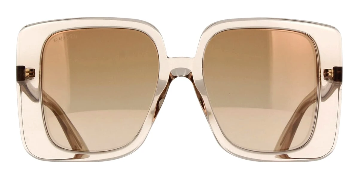 This square Gucci sunglass comes in a shiny beige crystal frame with brown gradient with light mirror lenses.