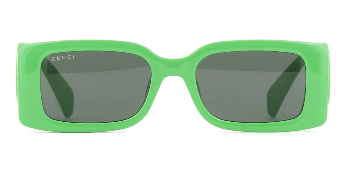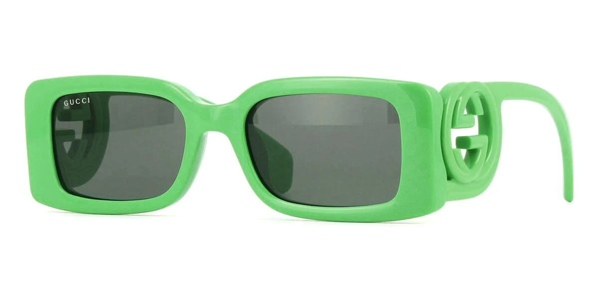 This square Gucci sunglass comes in a shiny green frame with grey with light mirror lenses.