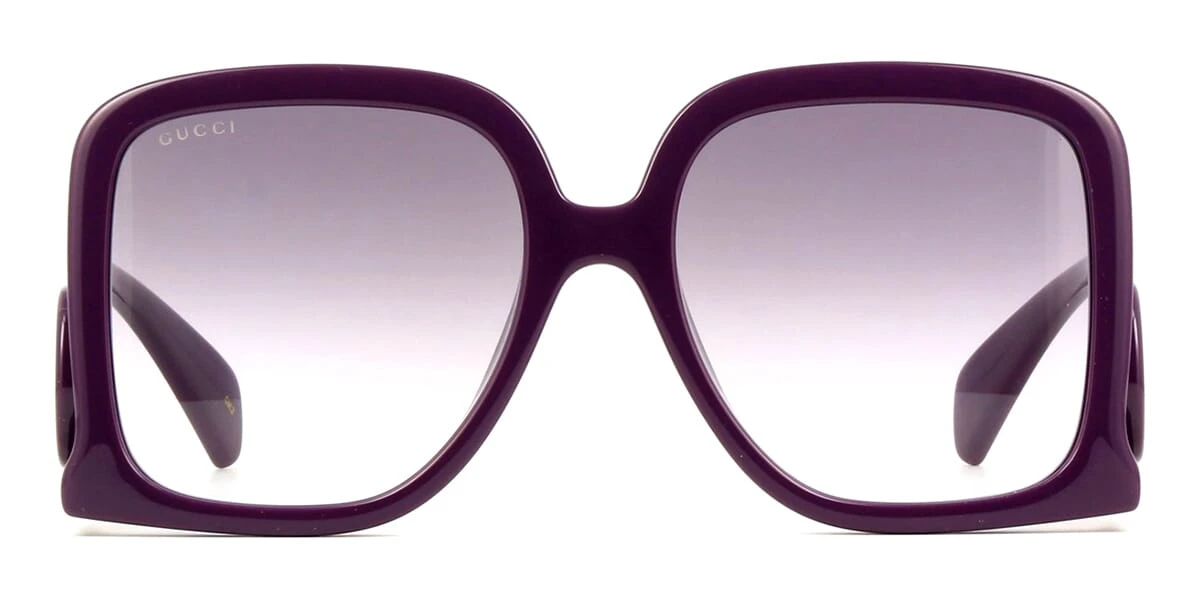 This square Gucci sunglass comes in a violet frame with light grey gradient lenses.