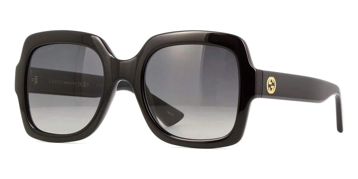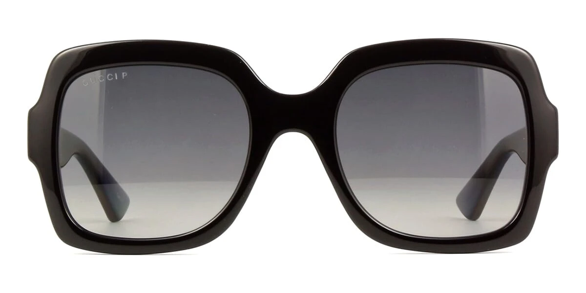 This square Gucci sunglass comes in a shiny black frame with grey gradient polarised lenses.