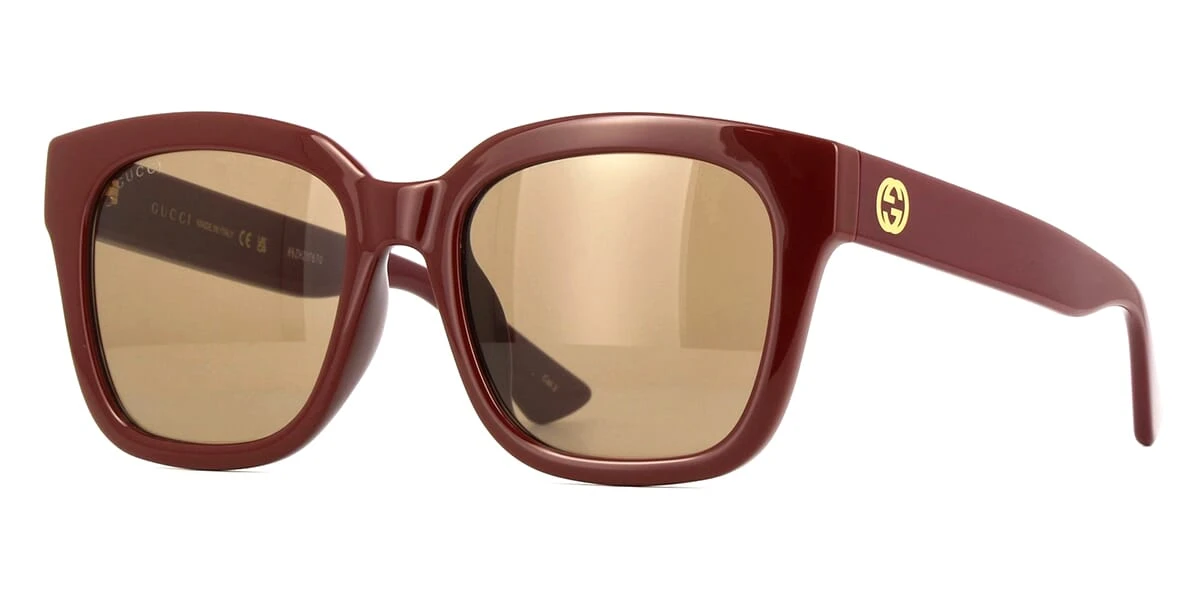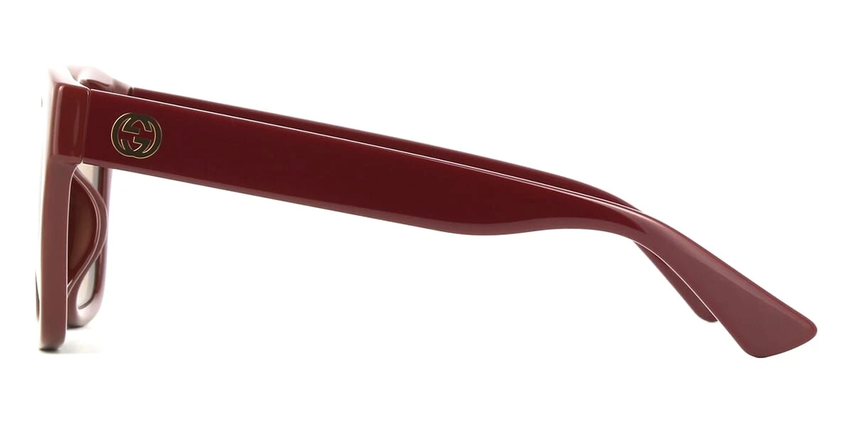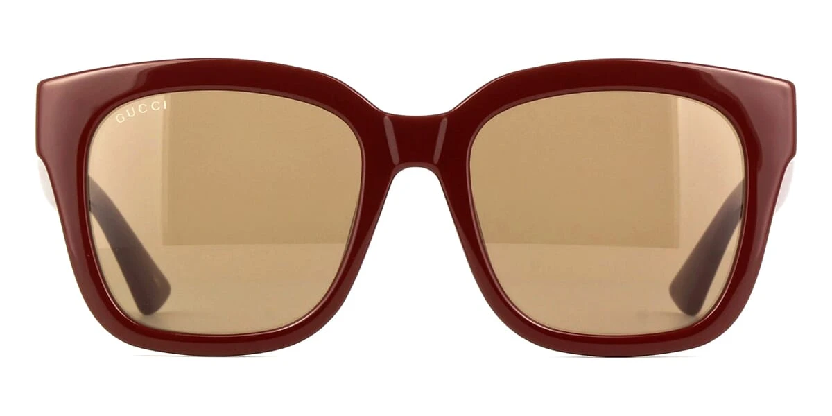 This square Gucci sunglass comes in a shiny burgundy frame with light brown lenses.