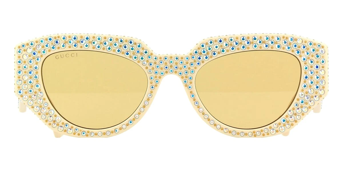 This cat eye Gucci sunglass comes in a ivory white with stones frame with brown with light mirror lenses.