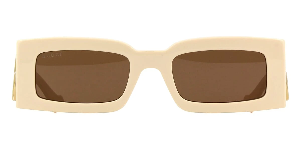 This rectangular Gucci sunglass comes in a ivory white frame with brown with light mirror lenses.