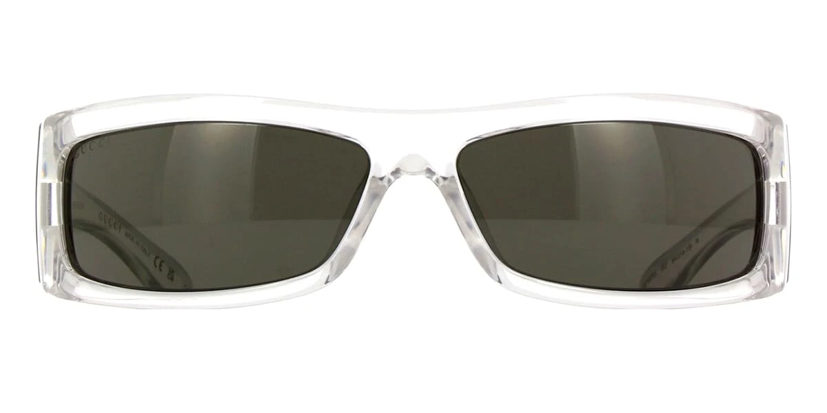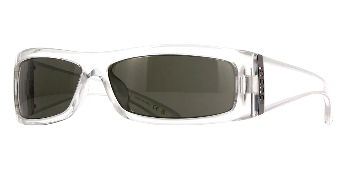 This wraparound Gucci sunglass comes in a crystal frame with grey with light mirror lenses.