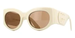 This round Gucci sunglass comes in a shiny ivory frame with brown with light mirror lenses.