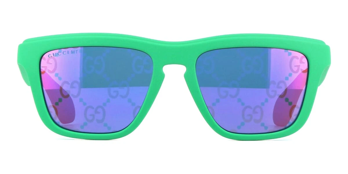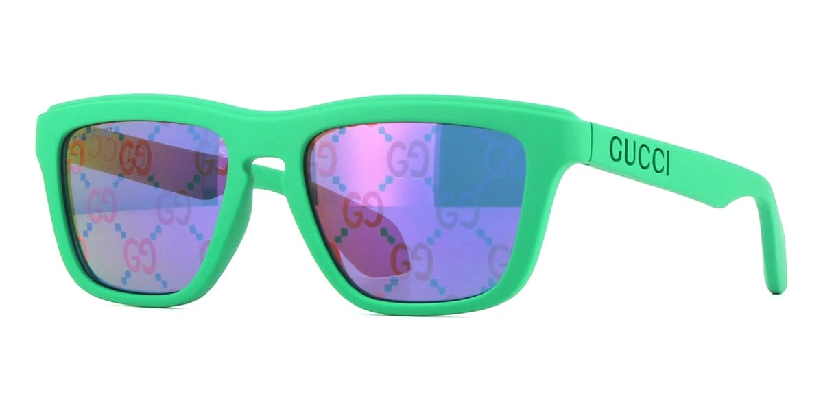 This square Gucci sunglass comes in a matte green frame with blue with fuchsia logo flash mirror lenses.