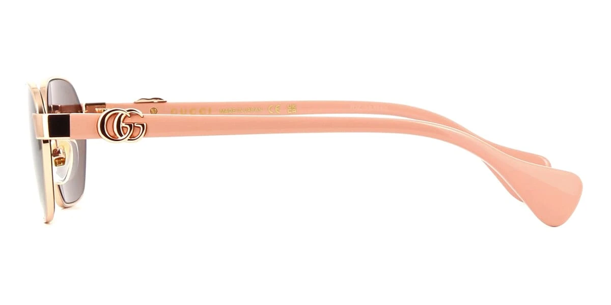 This square Gucci sunglass comes in a shiny rose gold and pink frame with violet lenses.