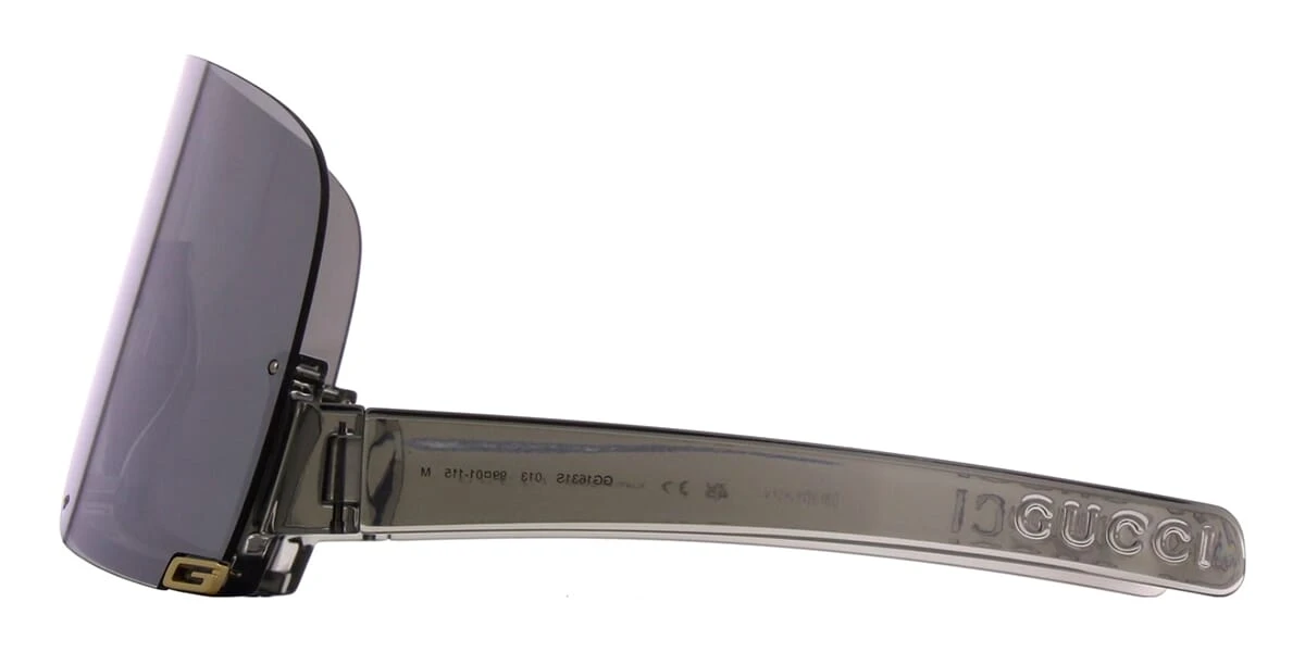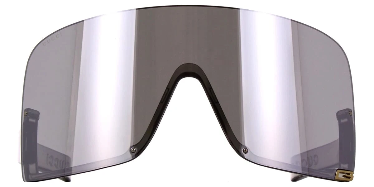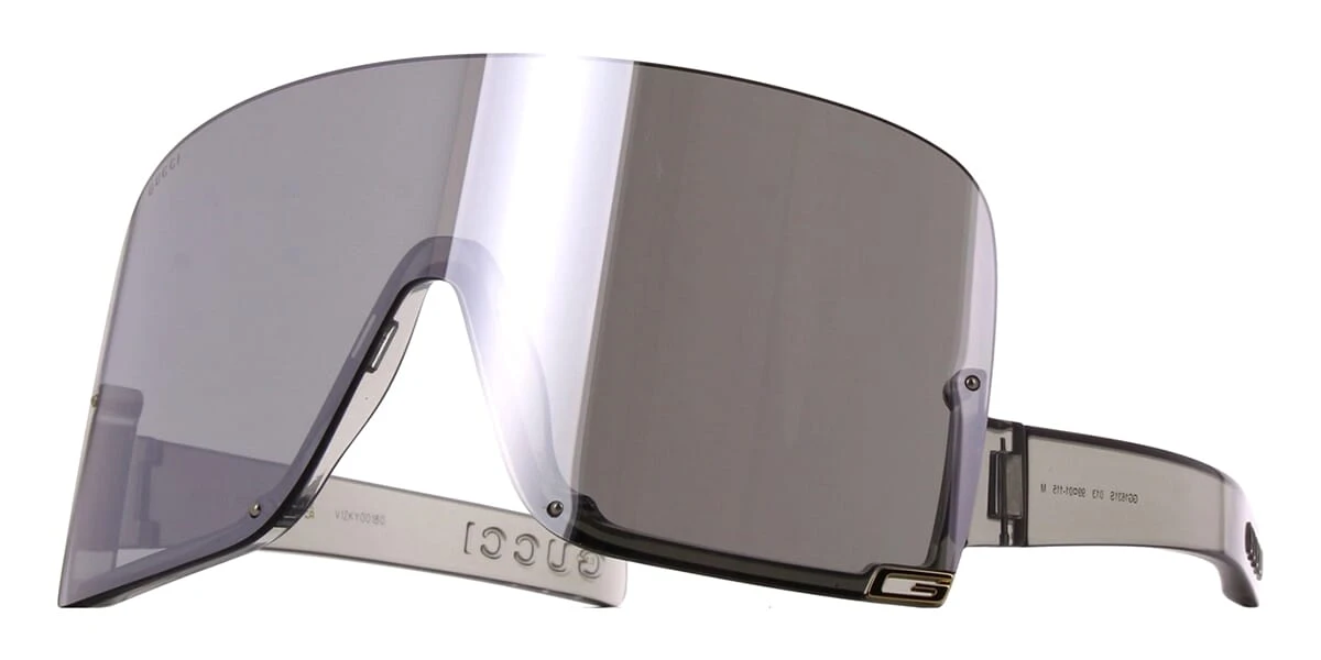 This shield Gucci sunglass comes in a grey crystal frame with grey with silver flash mirror lenses.