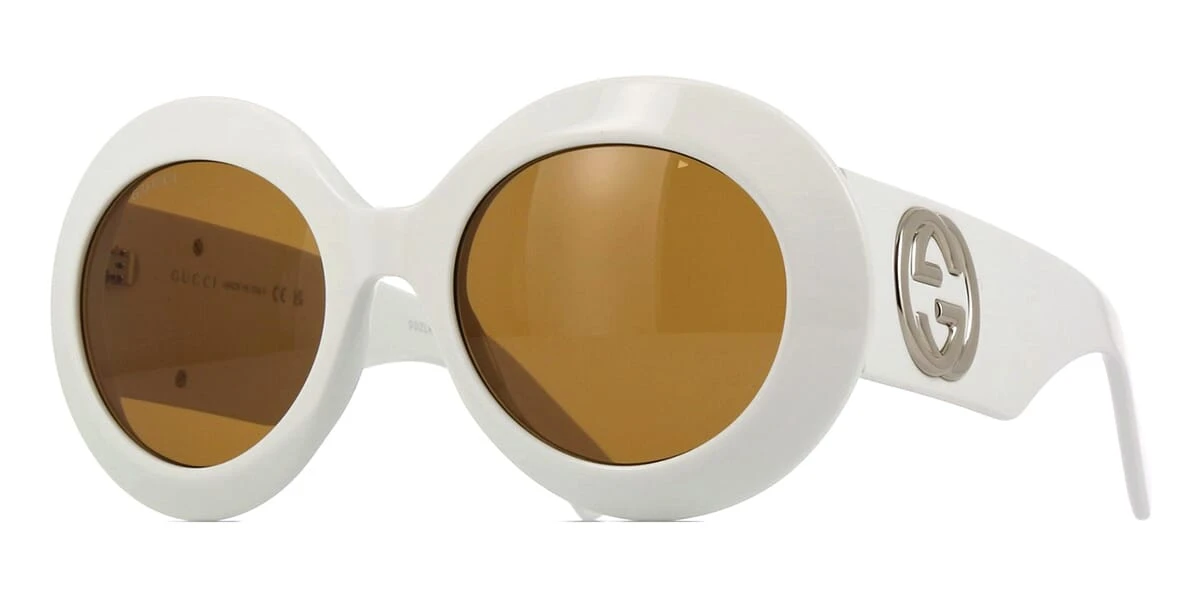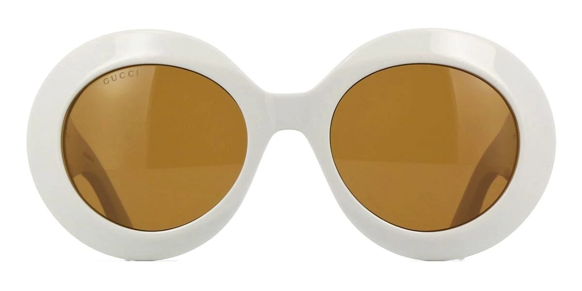 This round Gucci sunglass comes in a ivory white frame with brown with light mirror lenses.