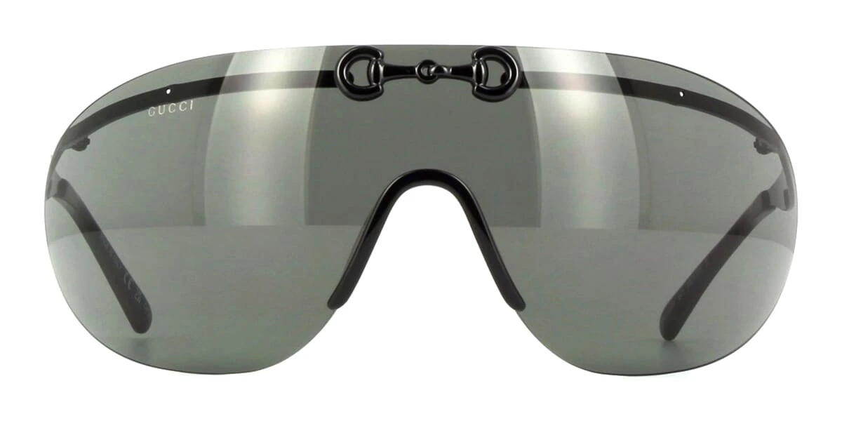 This shield Gucci sunglass comes in a shiny black frame with grey lenses.