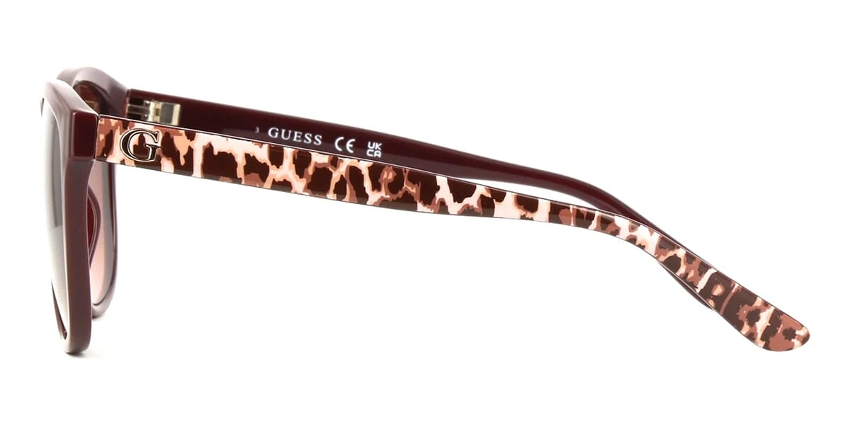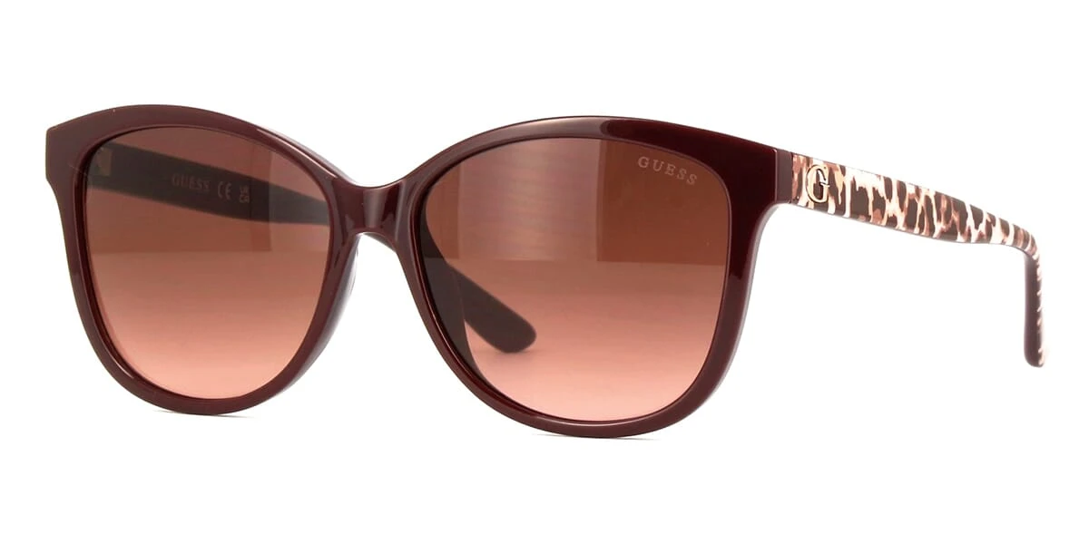 This cat eye Guess sunglass comes in a shiny burgundy red frame with brown gradient lenses.