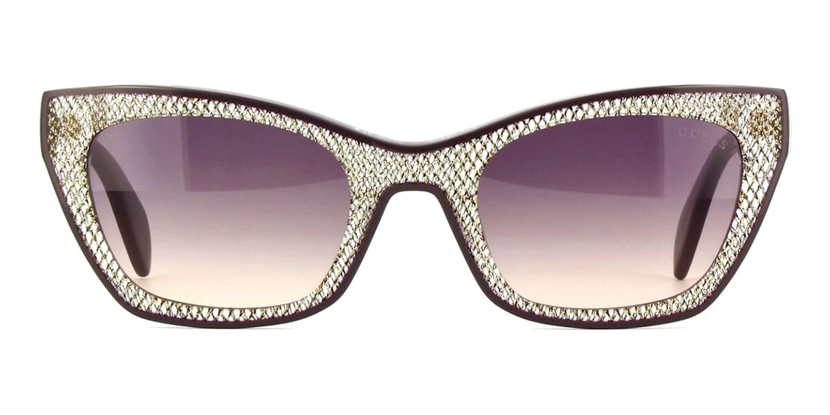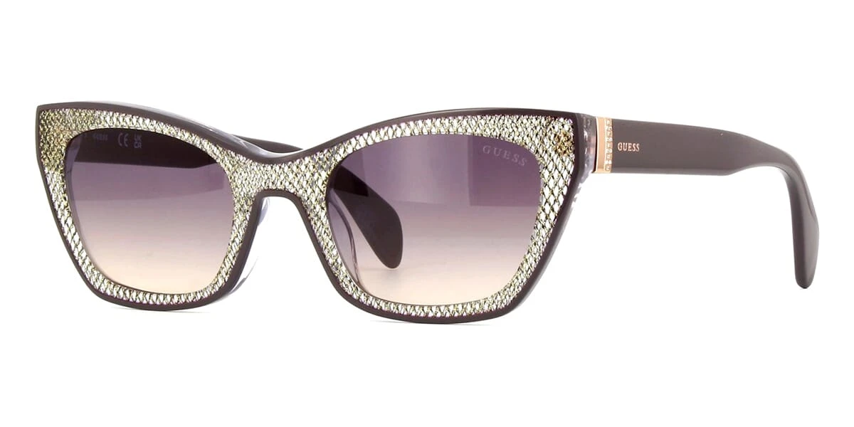 This cat eye Guess sunglass comes in a silver pattern with grey frame with brown gradient lenses.