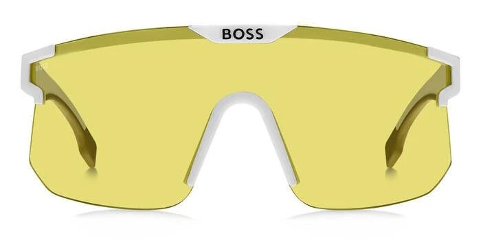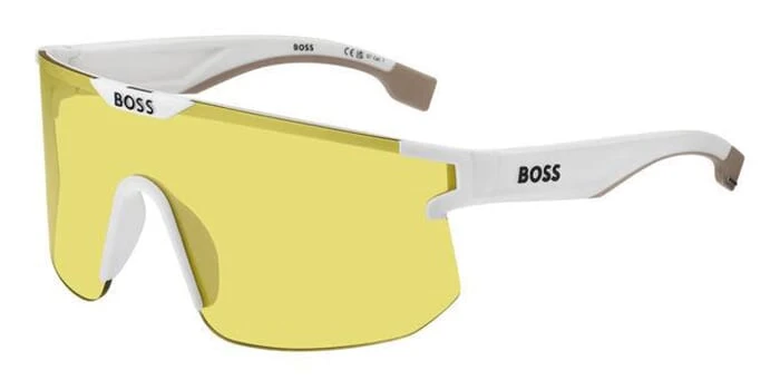 This shield Hugo Boss sunglass comes in a matte white frame with yellow lenses.