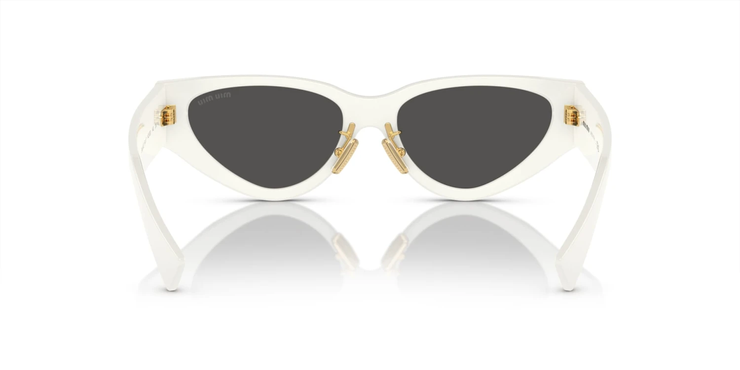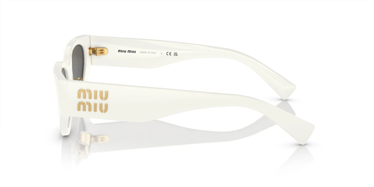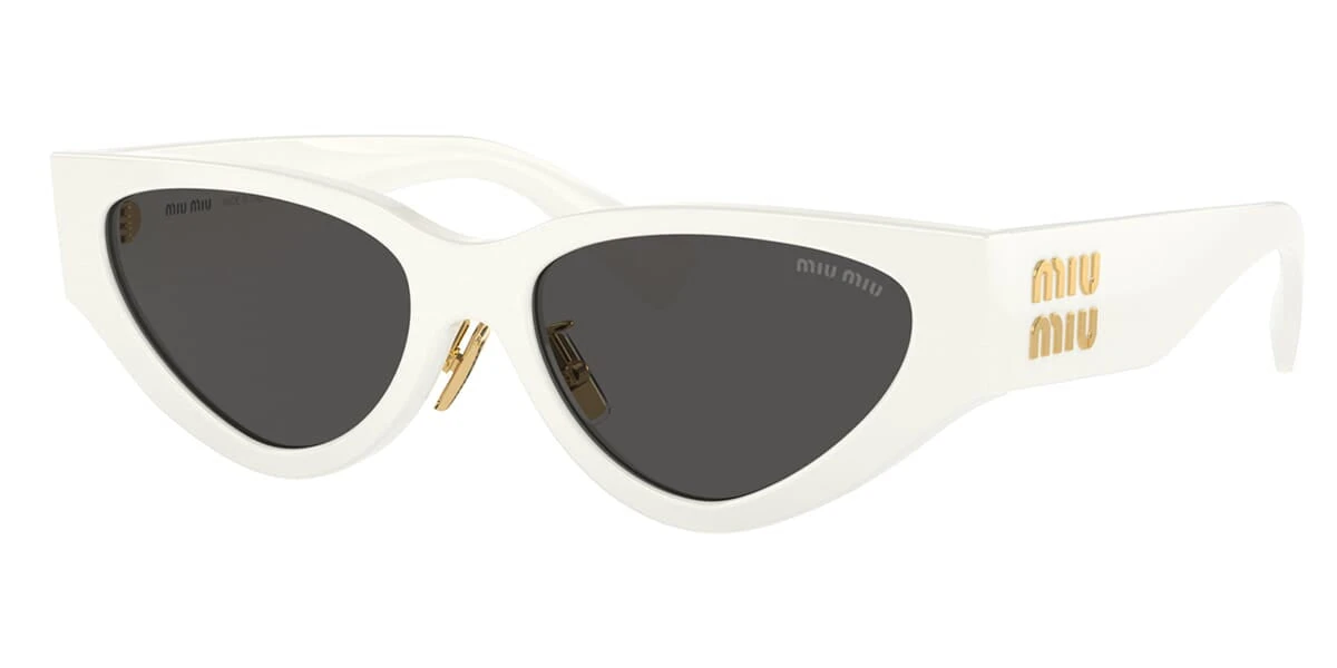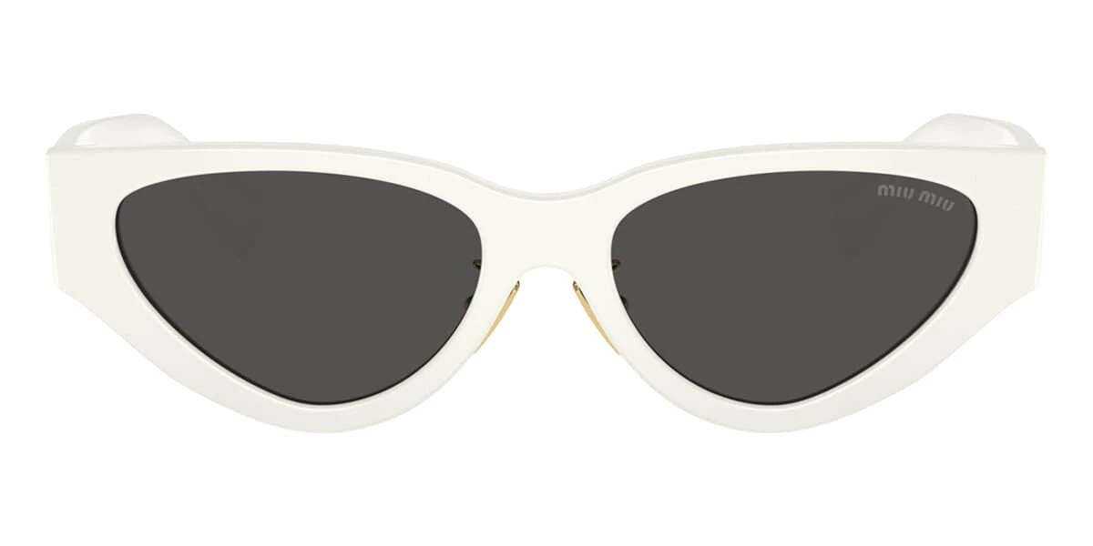 This cat eye Miu Miu sunglass comes in a white frame with dark grey lenses.