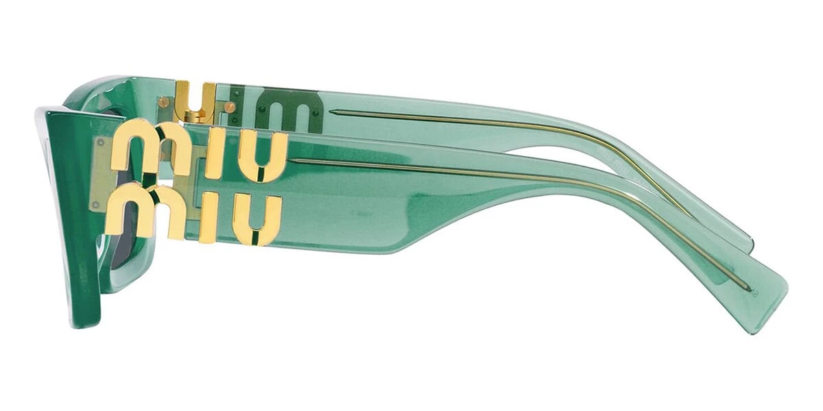 This rectangular Miu Miu sunglass comes in a opal anise frame with dark grey lenses.