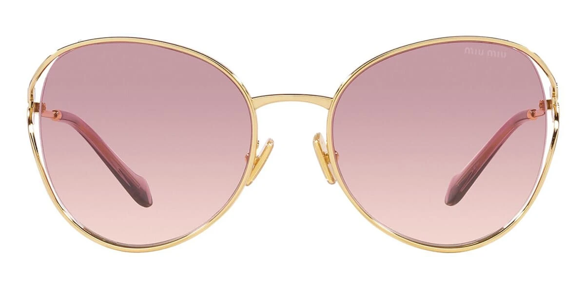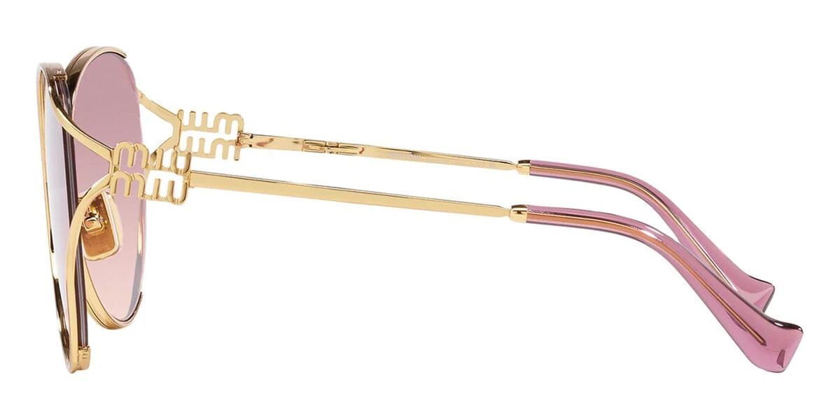 This round Miu Miu sunglass comes in a gold frame with brown to purple gradient lenses.