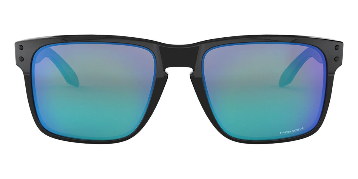 This square Oakley sunglass comes in a polished black frame with prizm sapphire lenses.