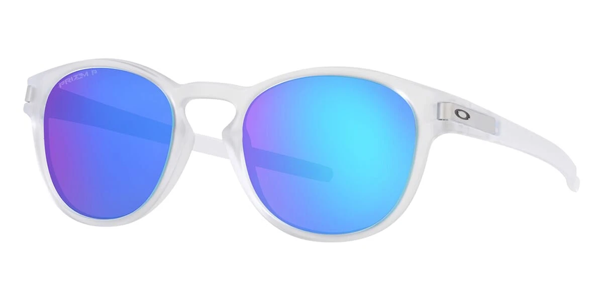 This round Oakley sunglass comes in a matte clear frame with prizm sapphire polarised lenses.