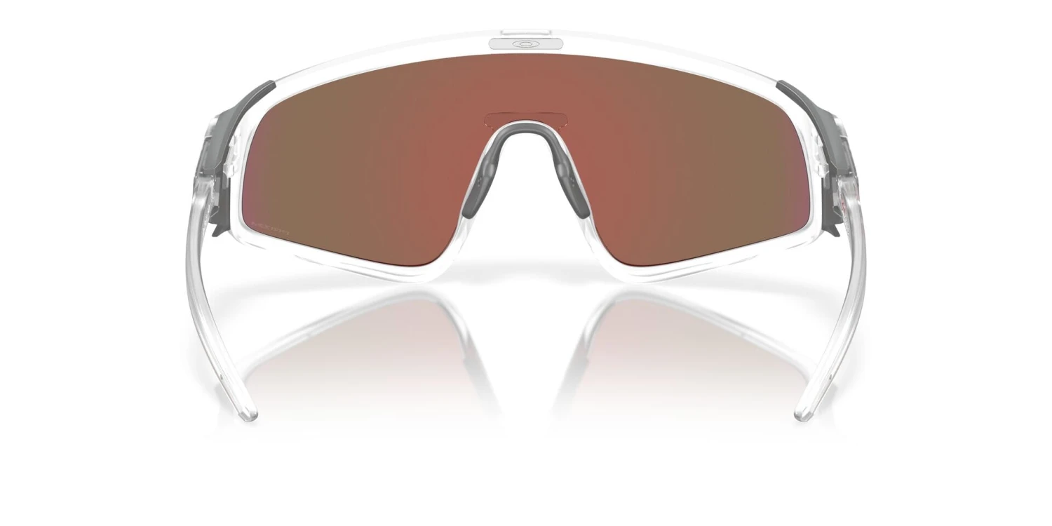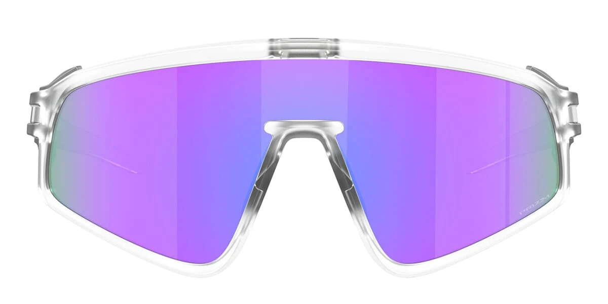This shield Oakley sunglass comes in a matte clear frame with prizm violet lenses.