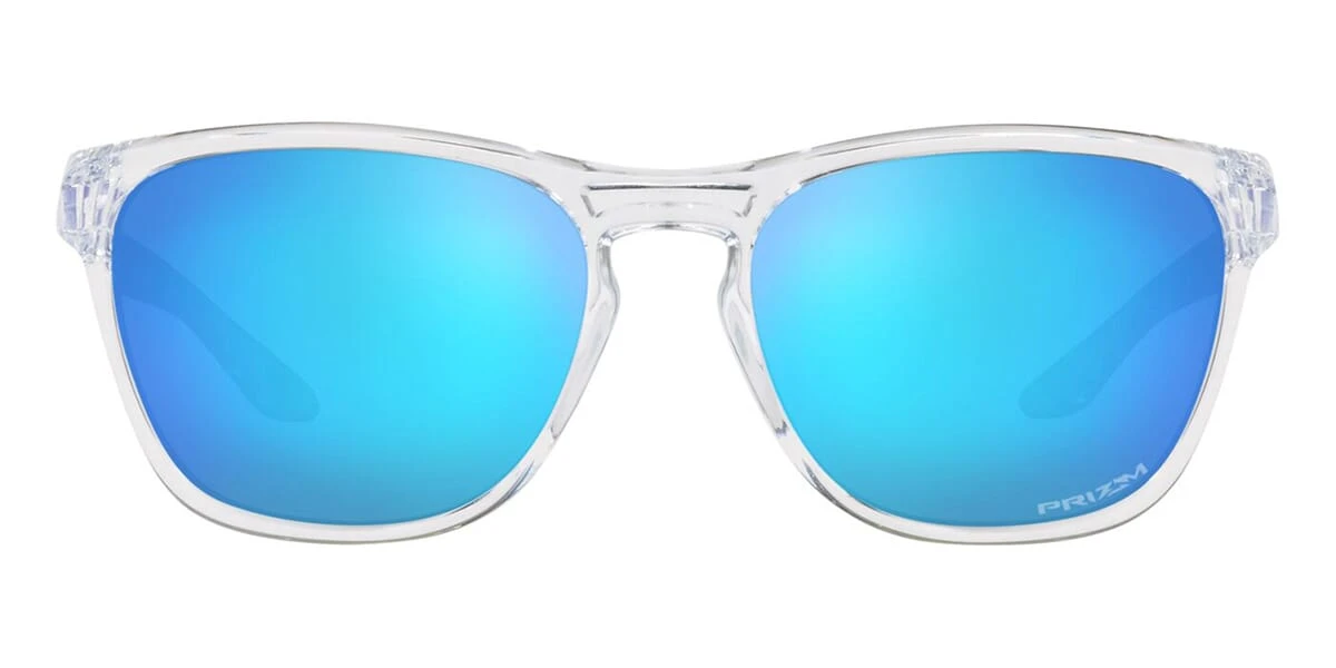 This square Oakley sunglass comes in a polished clear frame with prizm sapphire lenses.