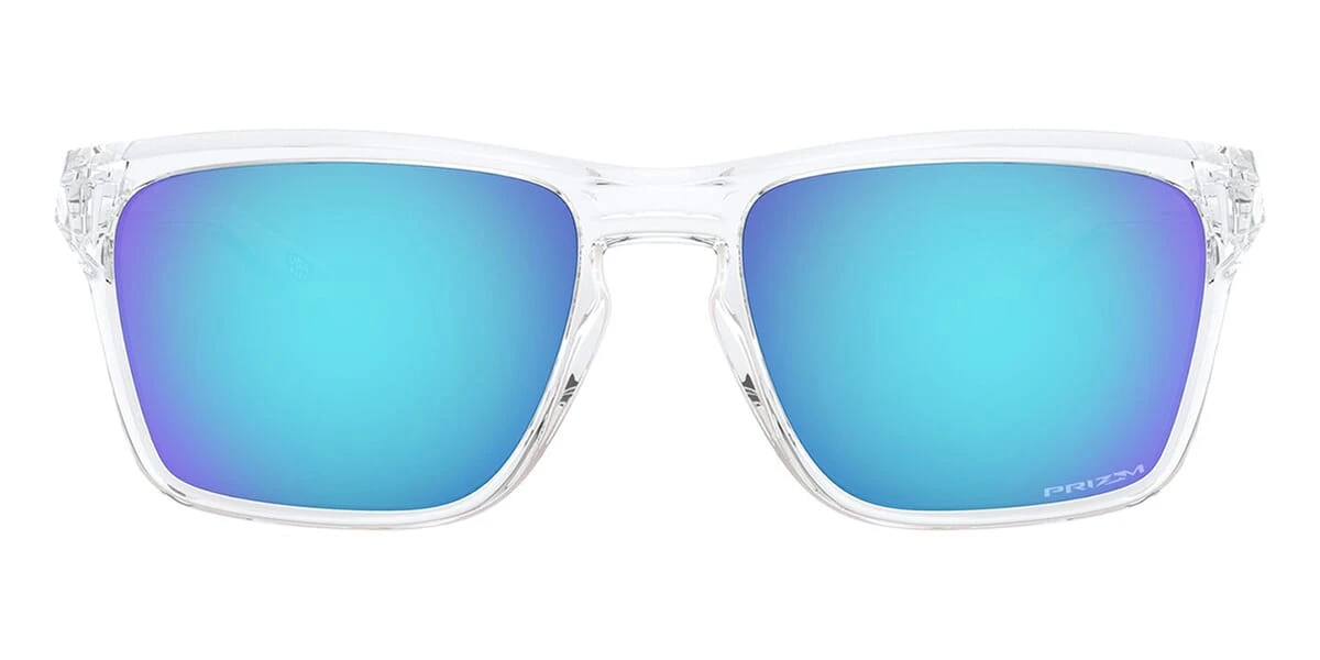 This rectangular Oakley sunglass comes in a polished clear frame with prizm sapphire lenses.