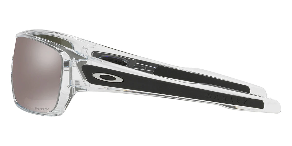 This rectangular Oakley sunglass comes in a polished clear frame with prizm black polarised lenses.