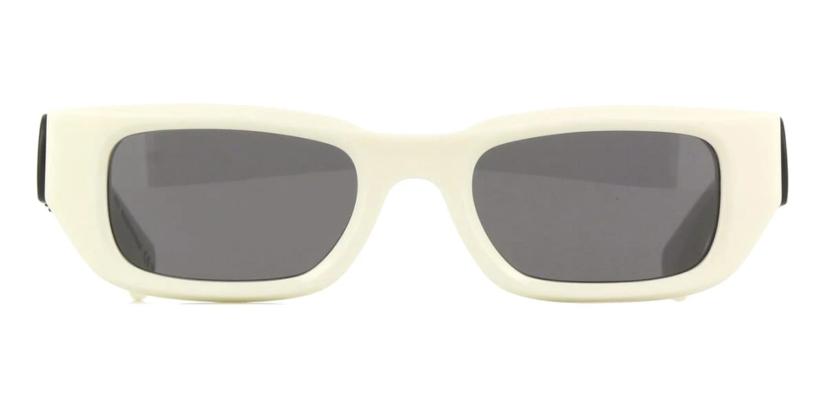 This square Off-White sunglass comes in a ivory white frame with dark grey lenses.