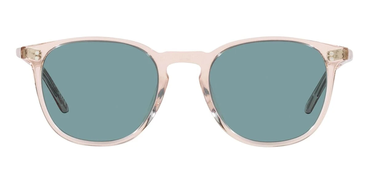 This aviator Oliver Peoples sunglass comes in a cherry blossom frame with teal polarised lenses.