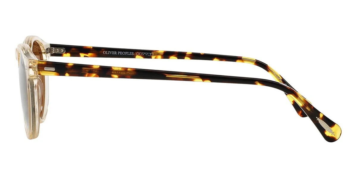 This round Oliver Peoples Gregory Peck sunglass comes in a buff and dark tortoise brown frame with gold mirror mg lenses.