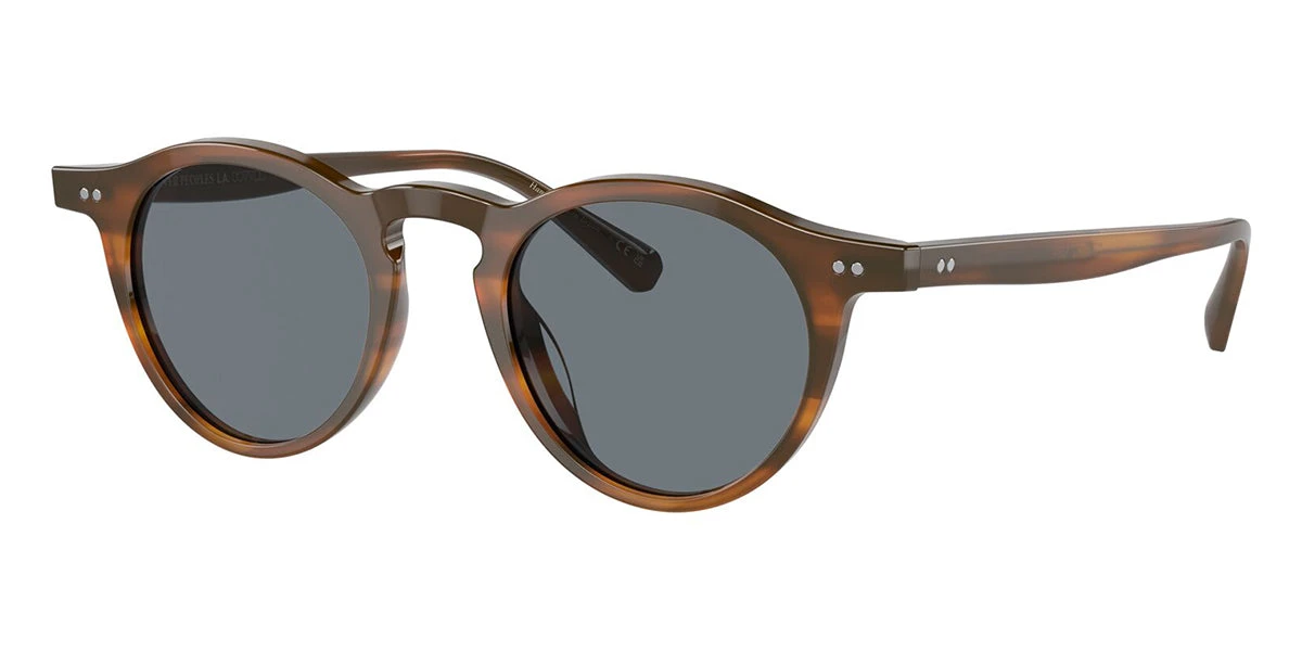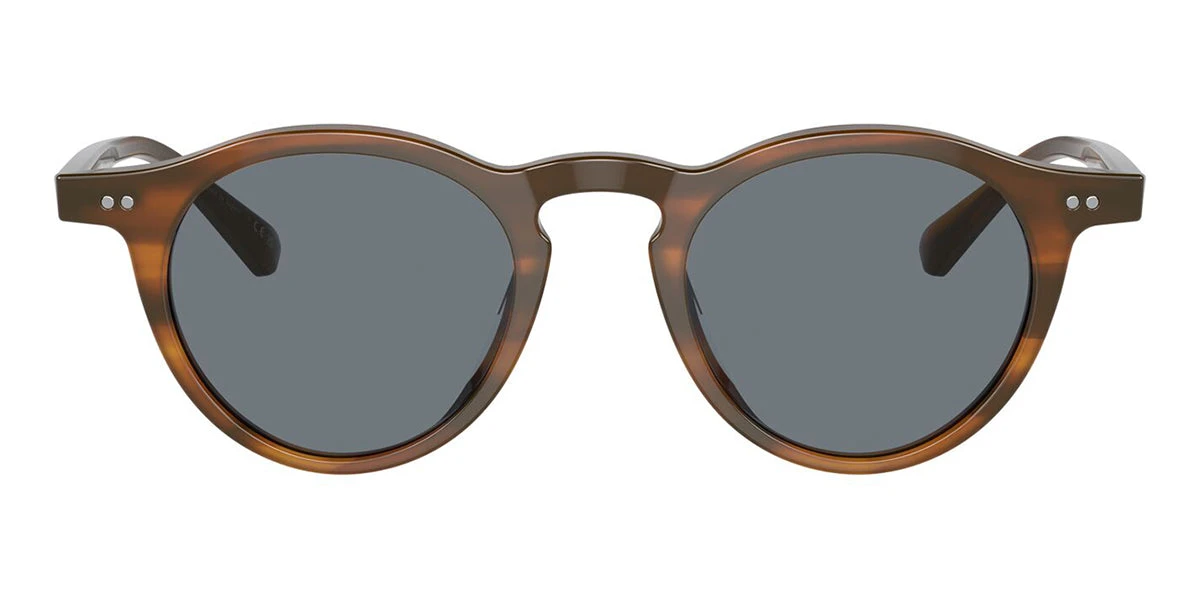 This round Oliver Peoples sunglass comes in a sycamore frame with indigo photochromic lenses.