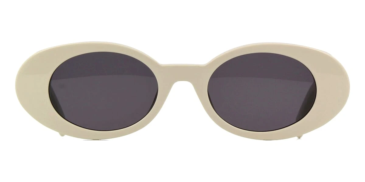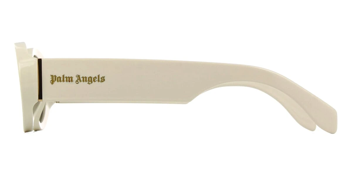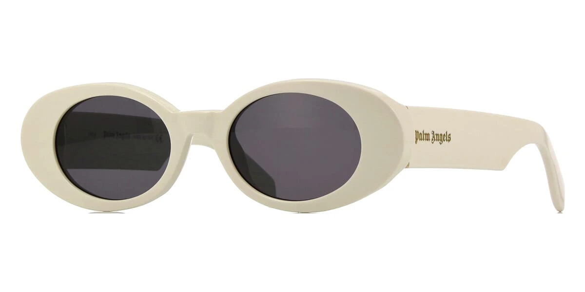 This cat eye Palm Angels sunglass comes in a ivory white frame with dark grey lenses.