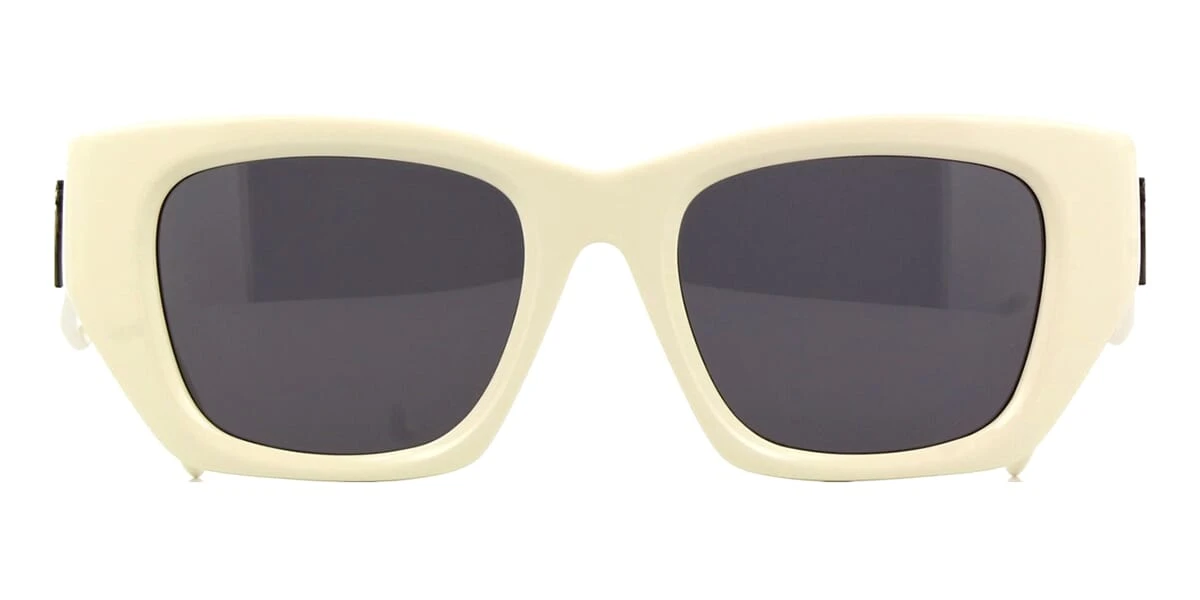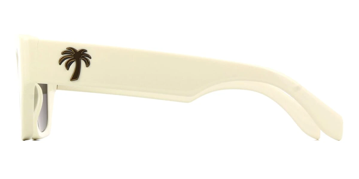 This square Palm Angels sunglass comes in a shiny ivory white frame with dark grey lenses.