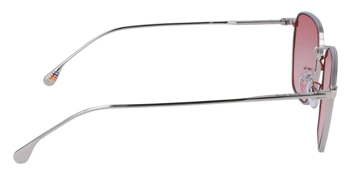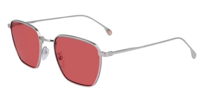This square Paul Smith sunglass comes in a shiny silver frame with red lenses.