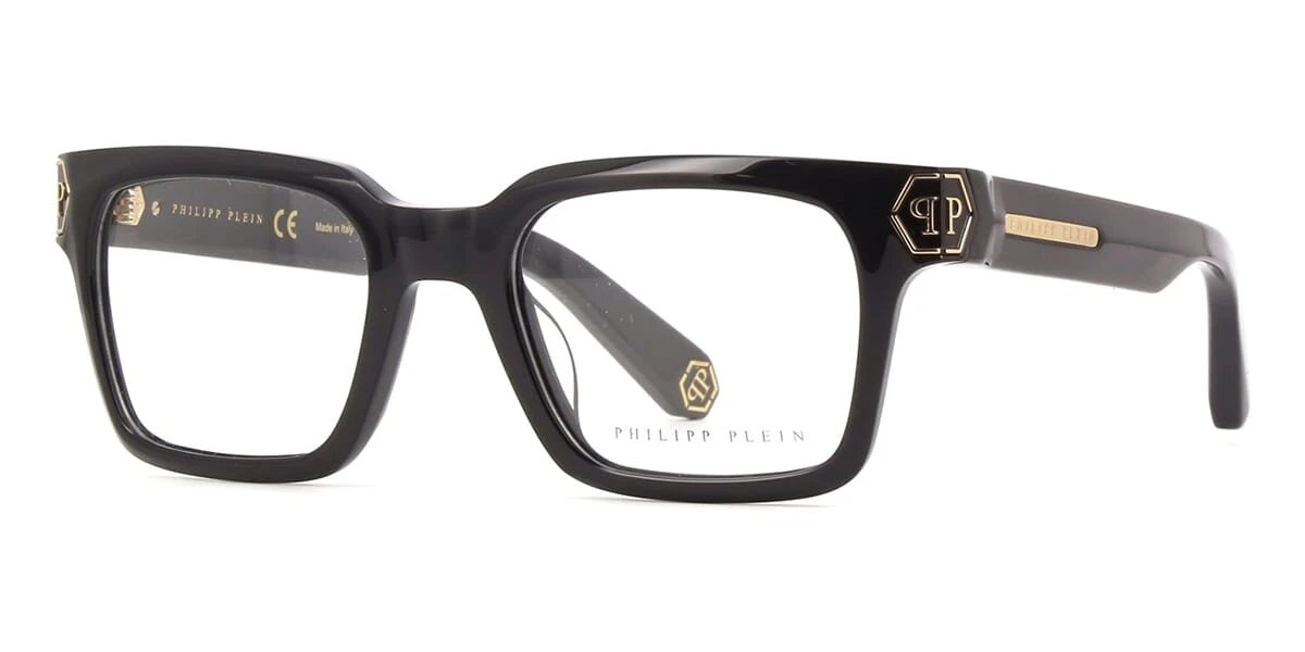 This square Philipp Plein optical comes in a shiny black with gold frame.
