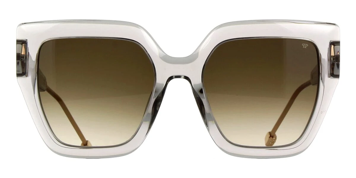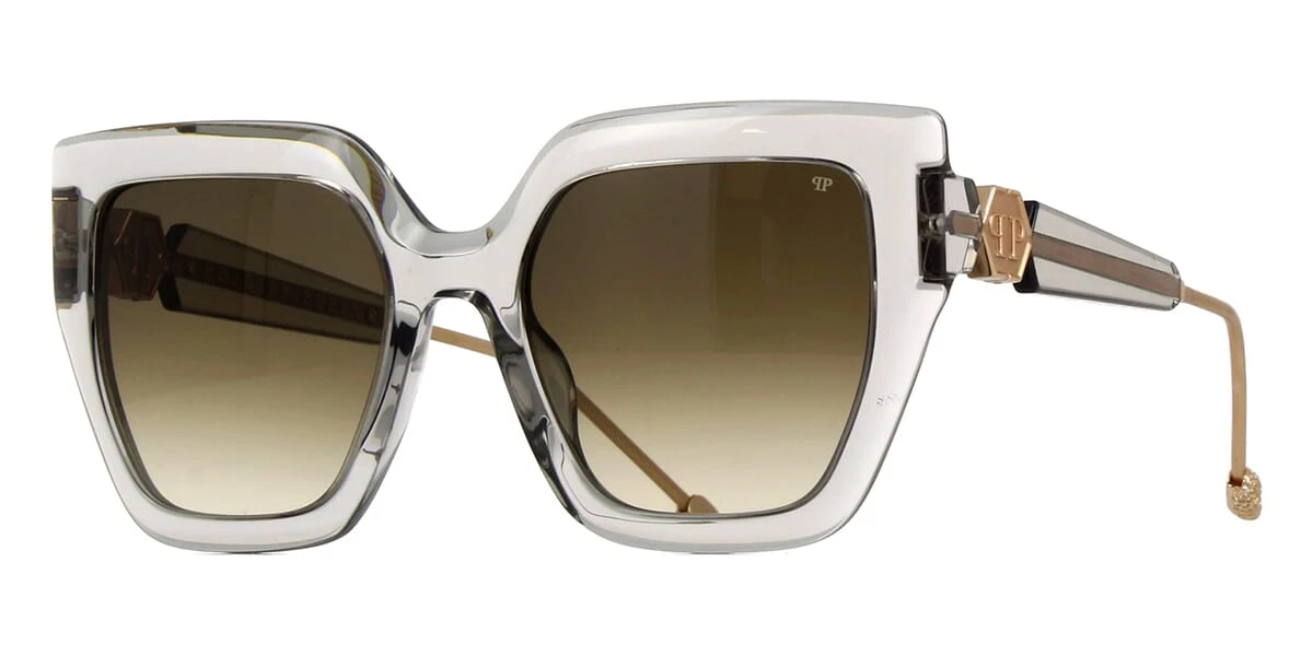 This square Philipp Plein sunglass comes in a grey crystal with gold frame with brown gradient lenses.