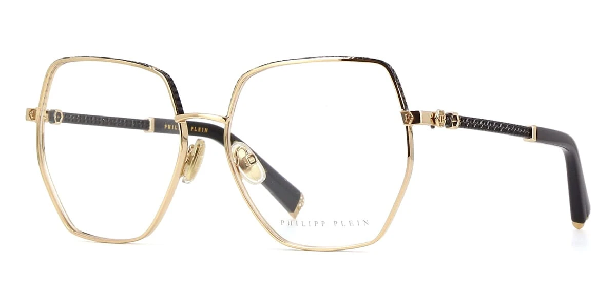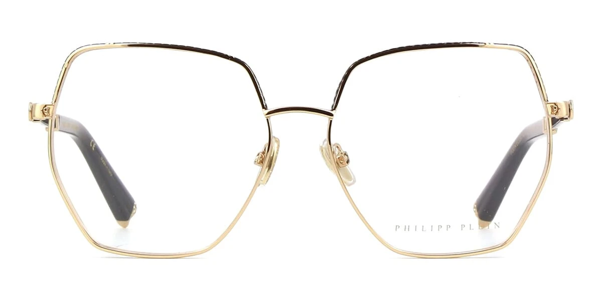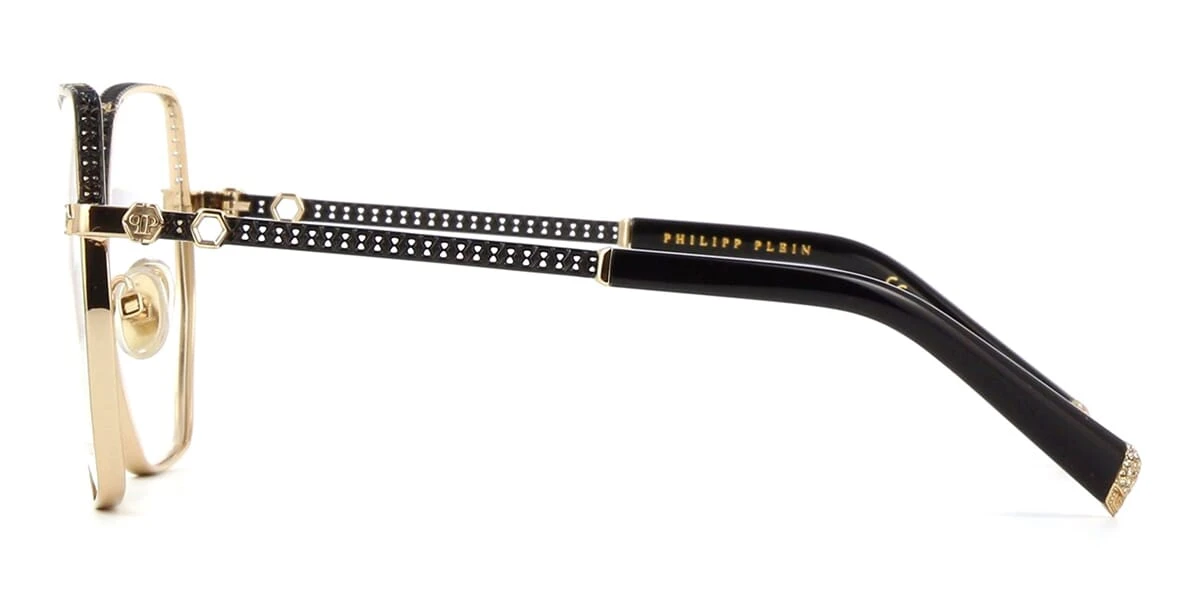 This square Philipp Plein optical comes in a shiny gold with black frame.